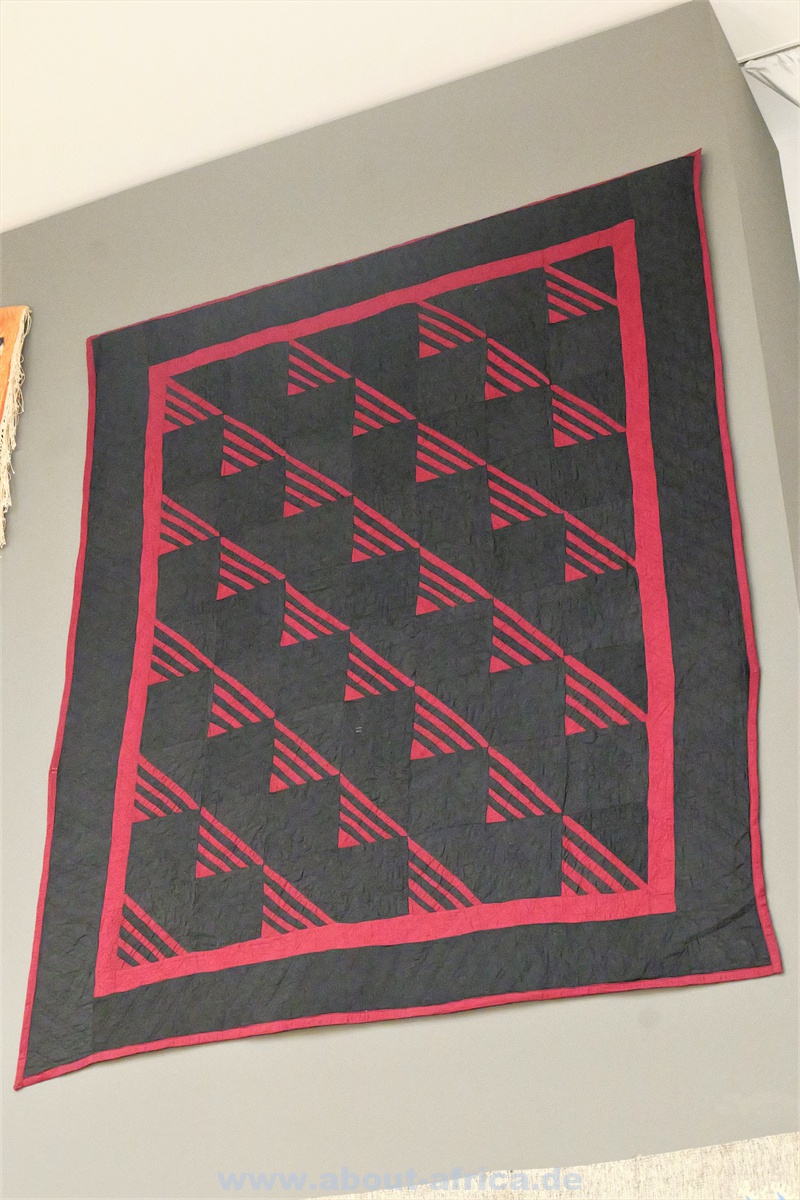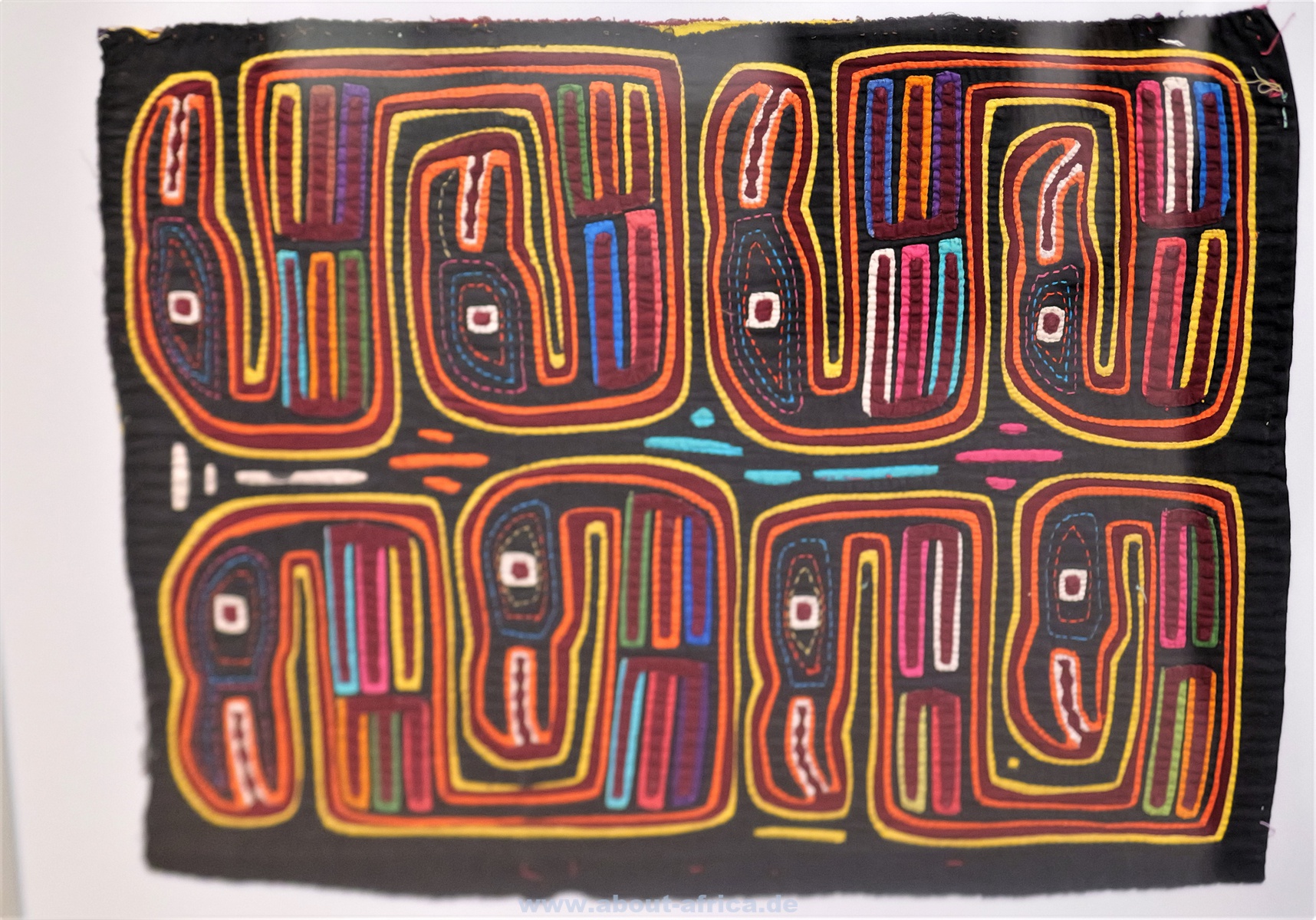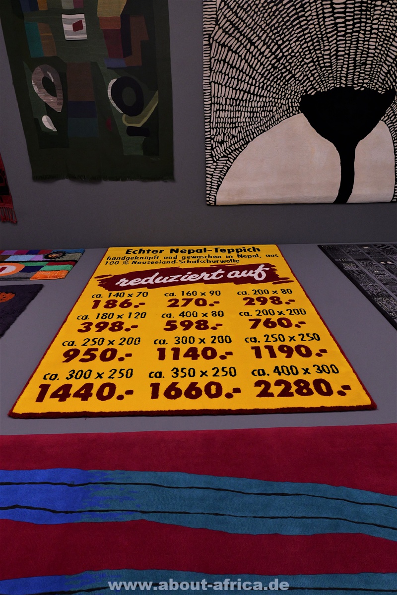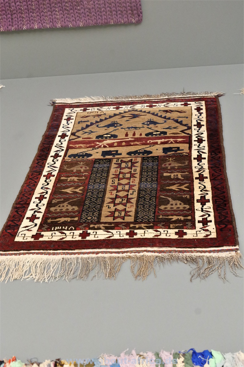 Im Gegensatz dazu werden Werke gezeigt, die figurativ arbeiten. So gibt es 2 kleinere Kriegsteppichen aus Afghanistan und eine Wand mit 20 Molas der Kuna aus Panama.