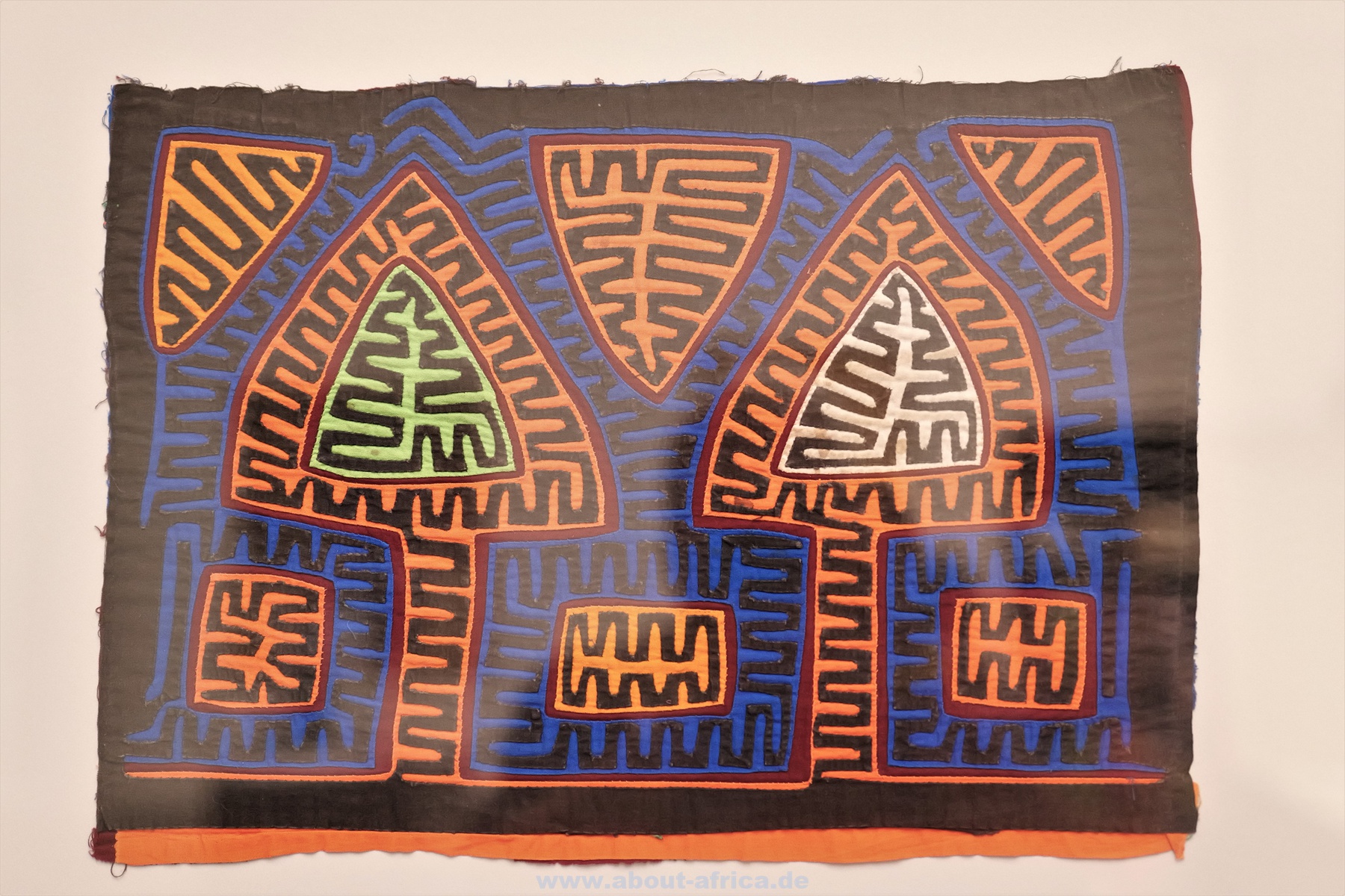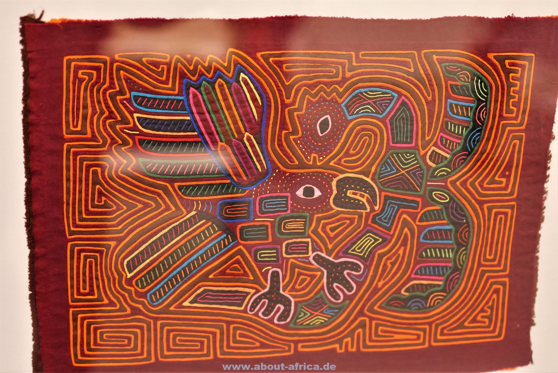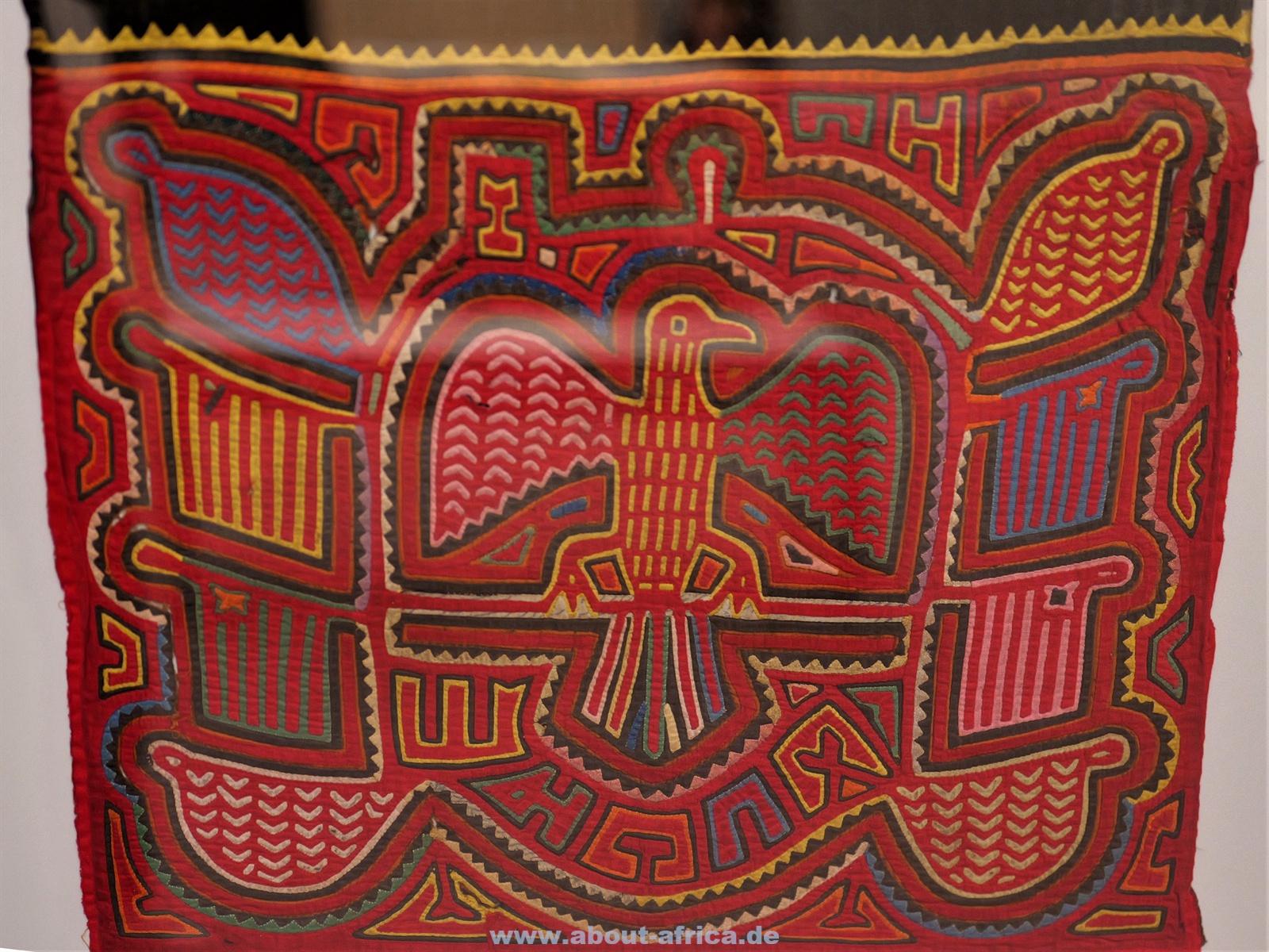 Im Gegensatz dazu werden Werke gezeigt, die figurativ arbeiten. So gibt es 2 kleinere Kriegsteppichen aus Afghanistan und eine Wand mit 20 Molas der Kuna aus Panama.