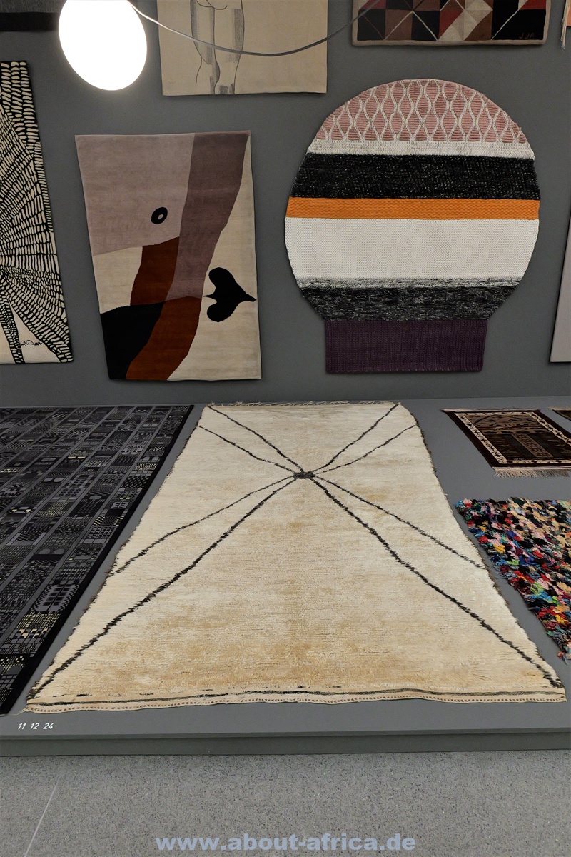 Die Ausstellung, die vom 21.7 bis zum 3.10.2023 geht, lässt sich von 4 Themen leiten: ‚Interdisziplinäre Sichtweisen‘, ‚Globale Narrative‘, ‚Textil und Raum‘ und ‚Innovative Entwicklungen‘. Dabei fand ich es besonders interessant, wie sehr sich Arbeiten aus verschiedenen Kulturkreisen ähneln. Deutlich wird dies vor allem bei geradezu geometrischen Mustern aus Marokko und der Hamisch. Beide haben die moderne Malerei beeinflusst und sehen aus wie konkrete Kunst. Und auch die ausgestellten Textilien von Künstlern des Bauhauses scheinen mit ihnen verwandt.