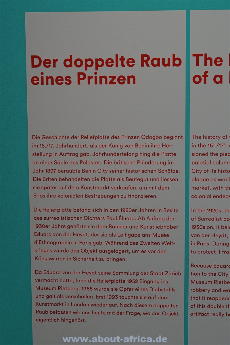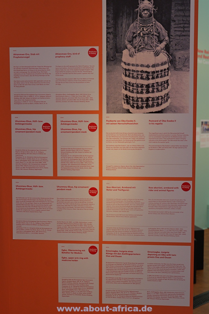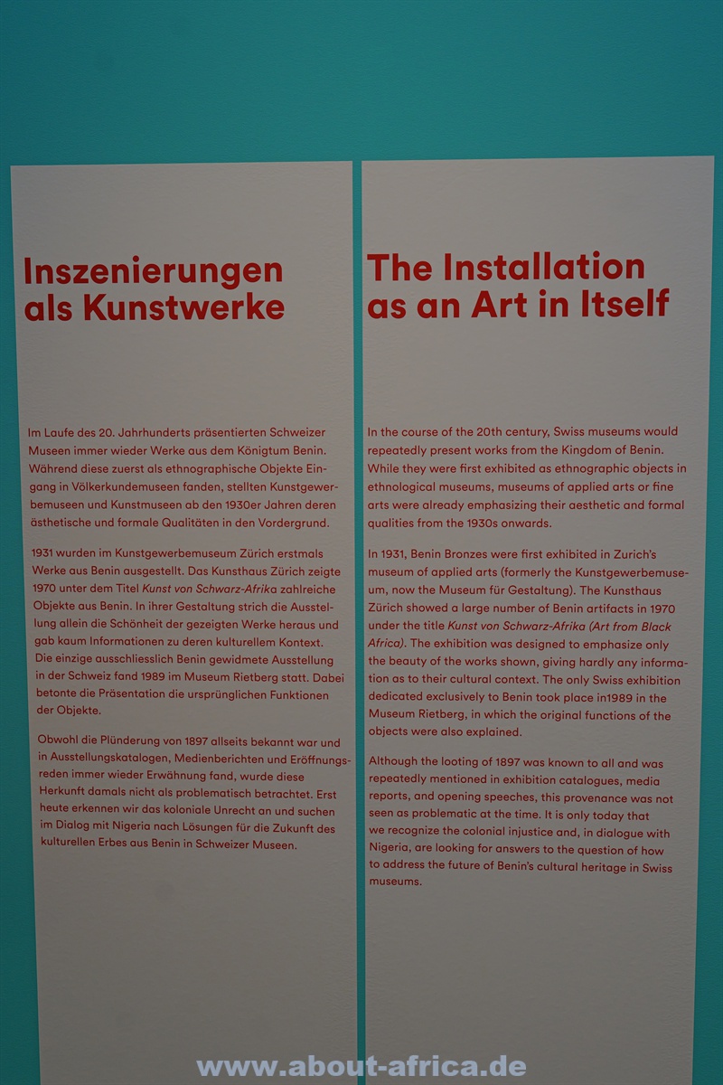 Die Ausstellung im Museum Rietberg ist einerseits nur schwer mit den ‚Abschiedsausstellungen‘ z.B. im MARKK in Hamburg (zum Video zur Aussstellung) oder im Rautenstrauch-Joest in Köln zu vergleichen: Das Museum Rietberg besitzt nur 16 Werke aus Benin - und damit deutlich weniger als die beiden deutschen Museen.