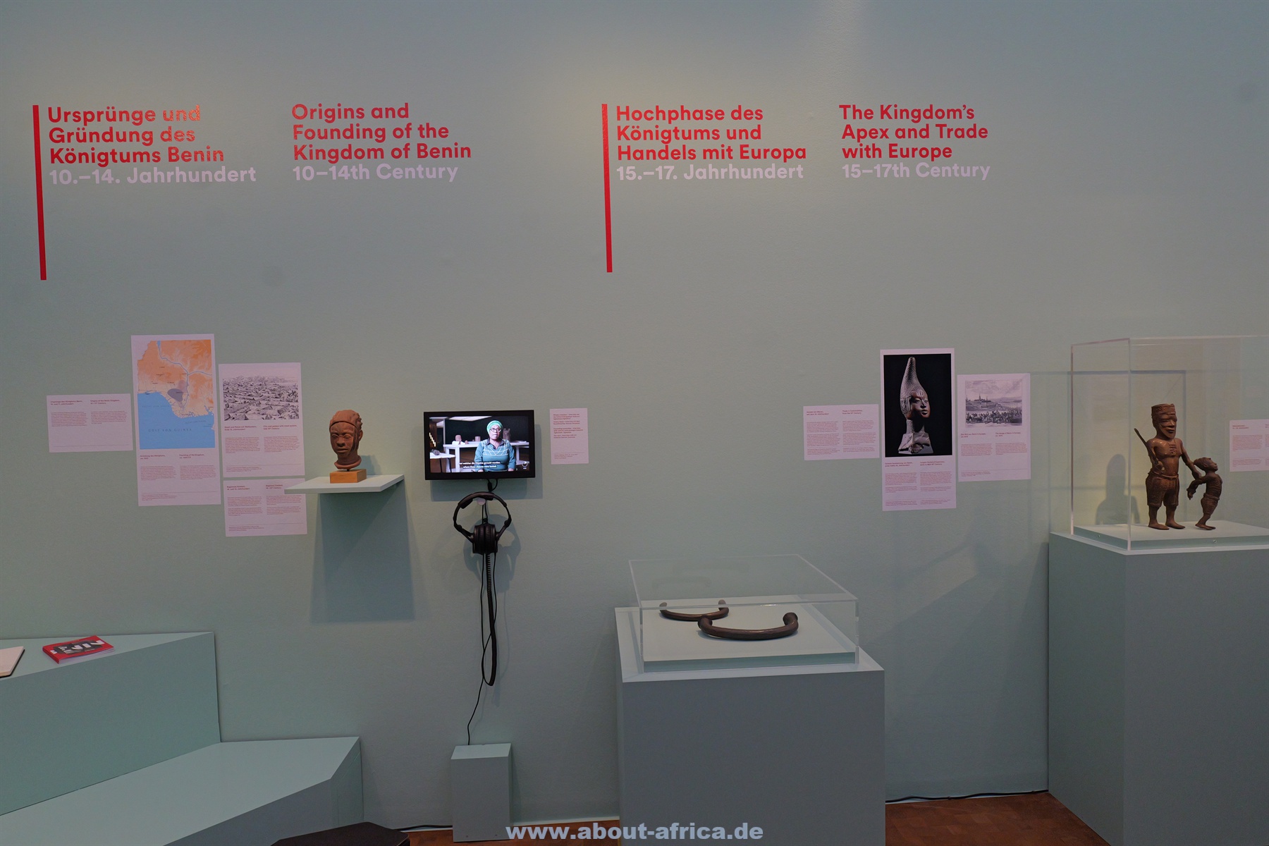 Auf der linken Seite folgt ein chronologischer Überblick, der die Geschichte des Königreichs Benin kurz zusammenfasst. Hier wird auch mit Text und einer Skulptur gezeigt, dass Benin über Jahrhunderte vom Sklavenhandel profitiert hat. Das ist etwas, was sich zum Beispiel Stuttgart (in seiner Dauerausstellung), Köln, aber - wenn ich mich richtig erinnere - auch Hamburg in ihren Ausstellungen nicht trauen. Dort werden die üblichen Opfer-Narrative erzählt. Dabei hatte z.B. der nigerianische Historiker Kenneth Dike schon Anfang der 1960er Jahre davor gewarnt, von Afrika „eine romantische Vergangenheit zu erfinden, die keinen Bezug zur Realität hat“. (P. Probst-Was ist afrikanische Kunst).
