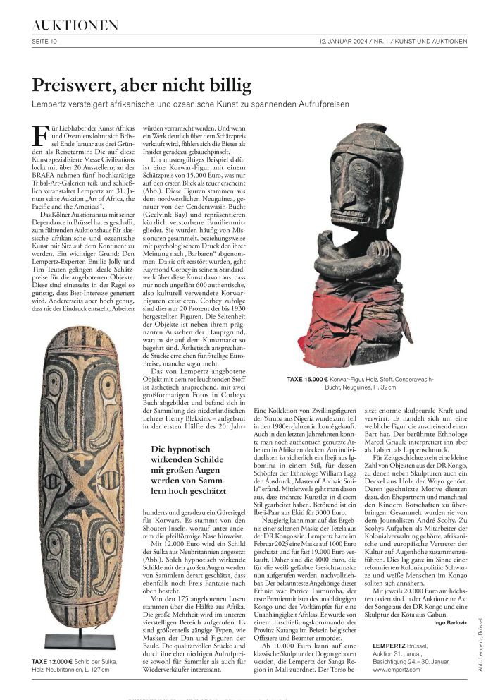 Mein Artikel zur Lempertz-Auktion 'Afrikanische und Ozeanische Kunst' am 31. Januar 2024 in Brüssel ist in der Kunst und Auktionen 1/2024 erschienen.
