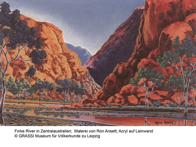 In Hermannsburg, einer Missionsstation 115 km südwestlich von Alice Springs, entstand das erste Zentrum moderner Ureinwohnerkunst in Australien. Die Ausstellung im Völkerkundemuseum Herrnhut präsentiert die Sammlung der Hermannsburger Künstler aus dem Bestand des GRASSI Museums. Die Künstler gehören zur ethnischen Gruppe der Aranda und zeigen in Landschaftsbildern die enge Verbundenheit zu ihrem Land. Diese Aquarellmalerei ist eine neue Facette der zeitgenössischen australischen Aboriginal Art.